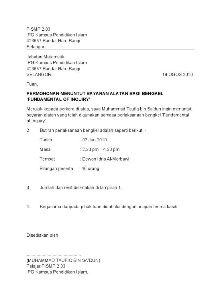 Saya nama no ic ingin memohon penangguhan bayaran balik pinjaman saya berharap agar pihak tuan dapat. Contoh surat rasmi tuntutan elaun have an image from the other contoh surat rasmi tuntutan elaun it also will include a picture of a sort that may be seen in the gallery of contoh surat rasmi tuntutan elaun. Contoh Surat Tuntutan Bayaran Perubatan picture uploaded ang published by Admin that preserved in our collection.